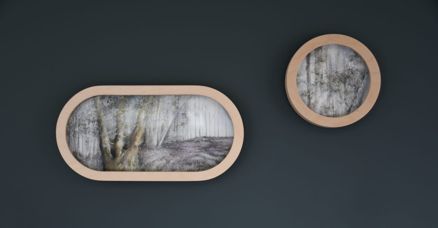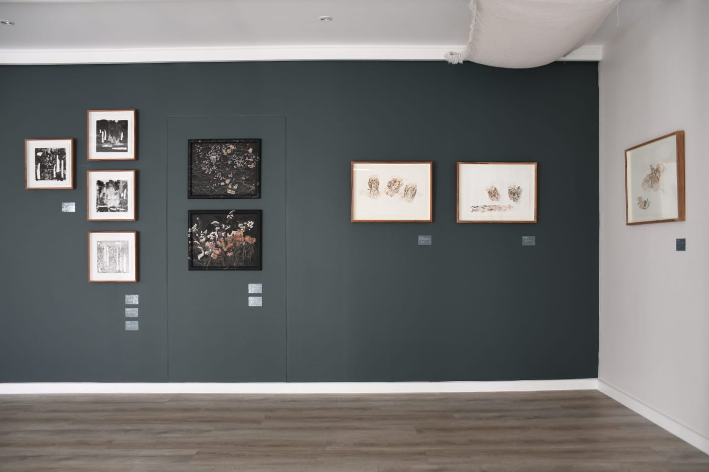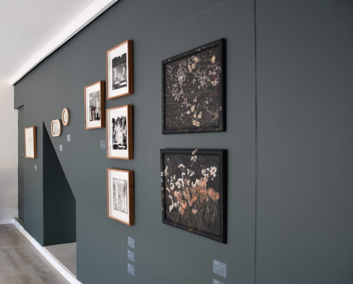 A curtain installation holds dead flowers in clear compartments, suspended like moments frozen in time, while a series of paintings occupies the frames that once housed family photographs. These frames become reliquaries, hosting layered memories and the painted remains of flowers, tethering personal mourning to the broader grief of environmental decline.