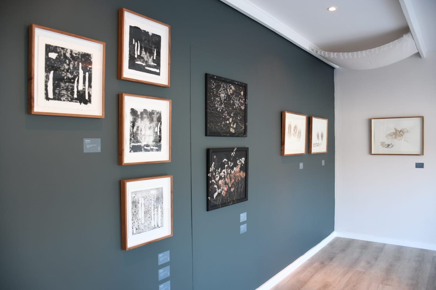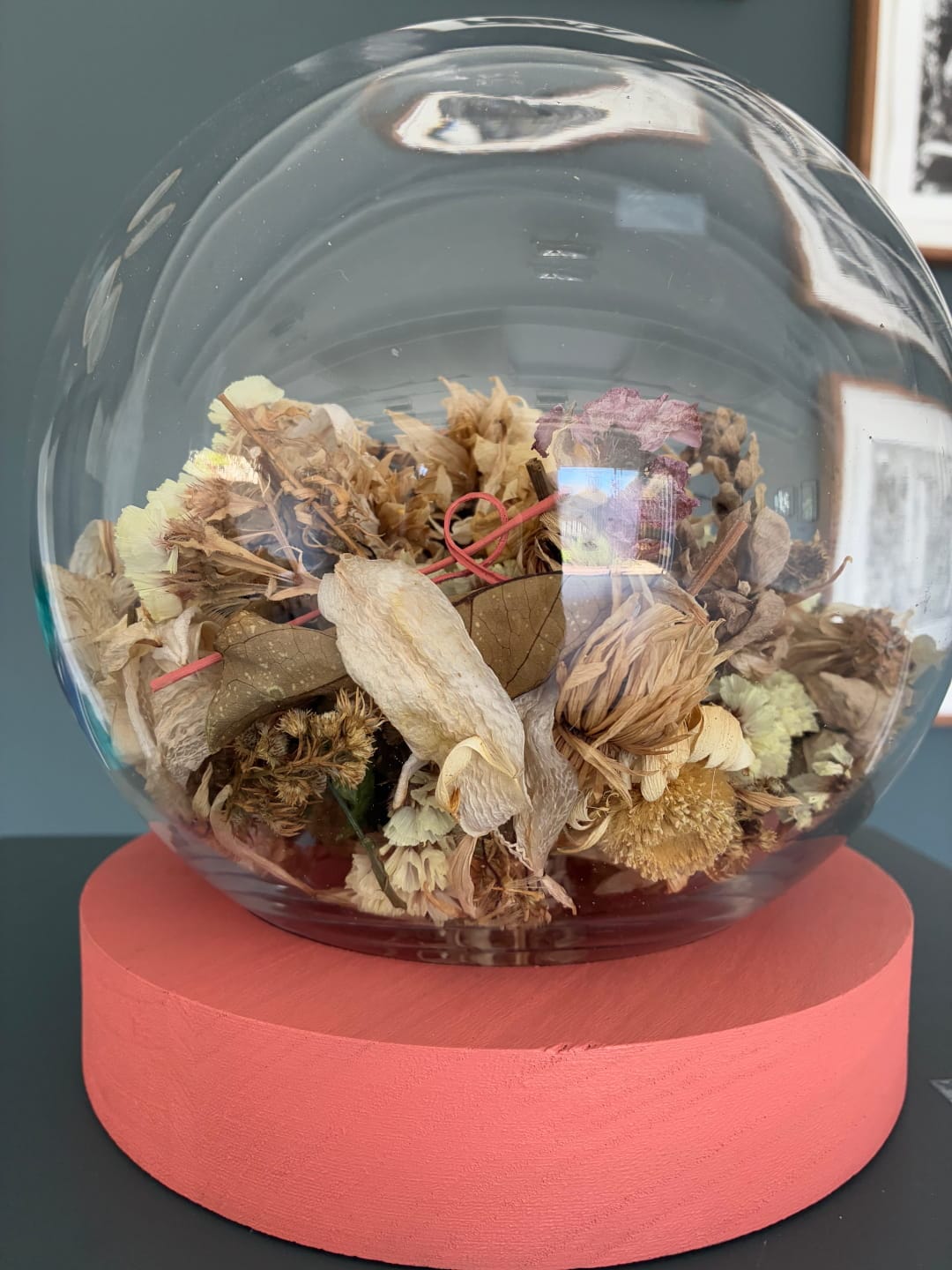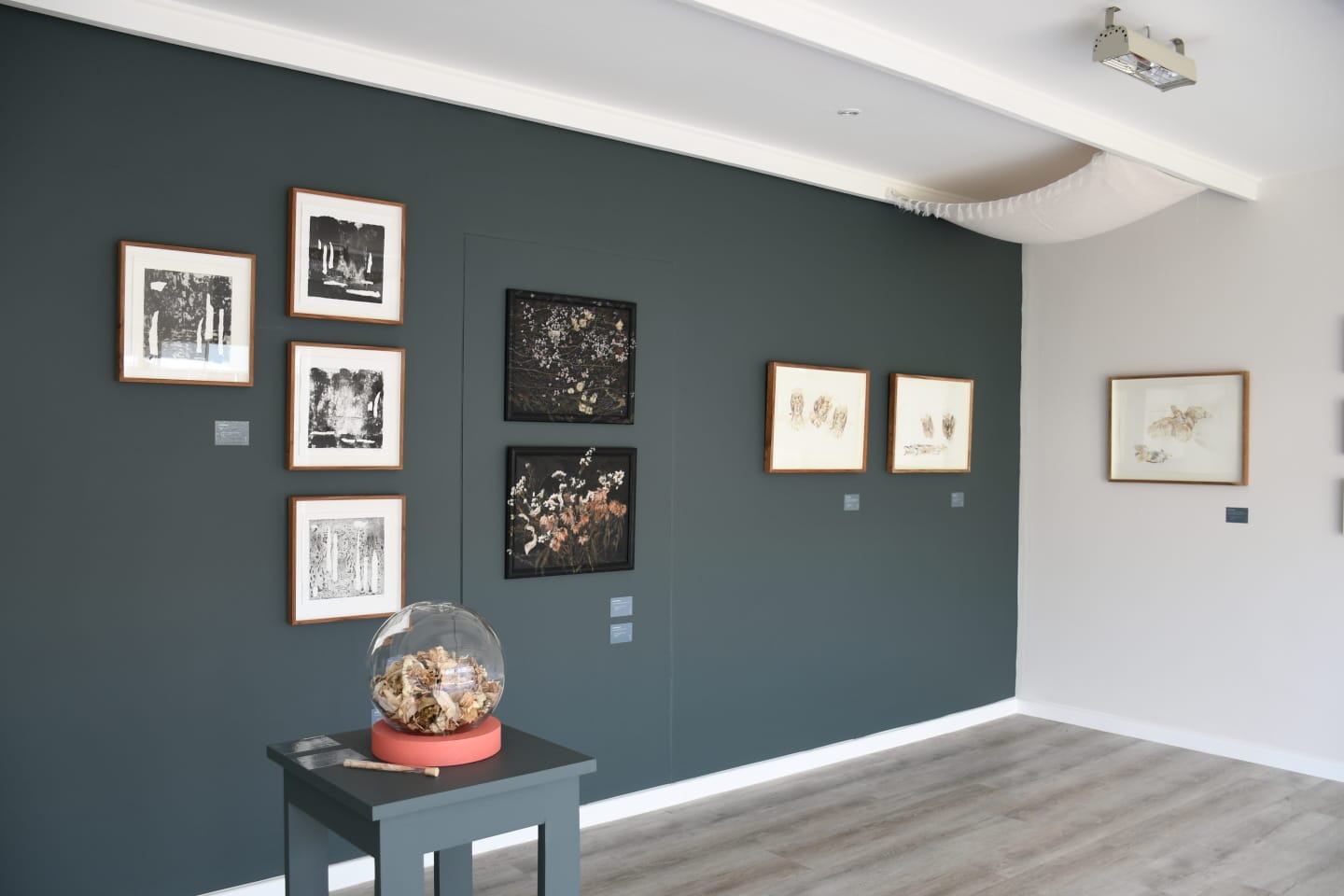 A curtain installation holds dead flowers in clear compartments, suspended like moments frozen in time, while a series of paintings occupies the frames that once housed family photographs. These frames become reliquaries, hosting layered memories and the painted remains of flowers, tethering personal mourning to the broader grief of environmental decline.