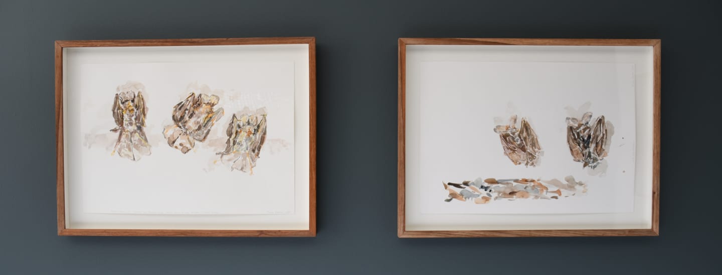 My relational method suggests that artistic processes such as observational drawings can pre-empt (and visualise) the formation of emotional bonds. By handling the wet specimens, I learned through touch. The artworks in bat behaviour, as markers of “getting closer” to bats, are invitations to look beyond popularised conceptions of bats, to engage with difference and specificity, and to follow these gestures of care.